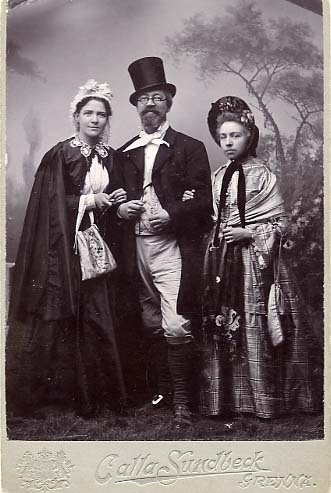 Kabinettsfotografi: gruppbild, troligen tablå, med Calla Sundbeck, Conrad Björkman och Eda Witt.