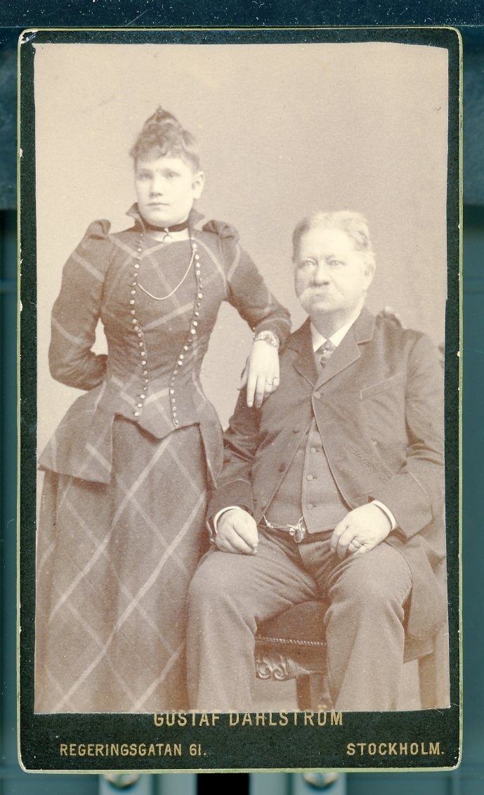 Kabinettsfotografi: J G Hall sittande i stol med Alma Hall, i storrutig klänning, stående vid hans högra sida, men armen vilande på hans axel.