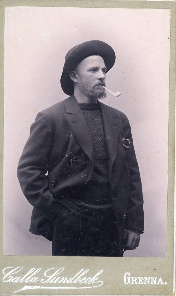 Kabinettsfotografi av en man med hatt och kritpipa i munnen.