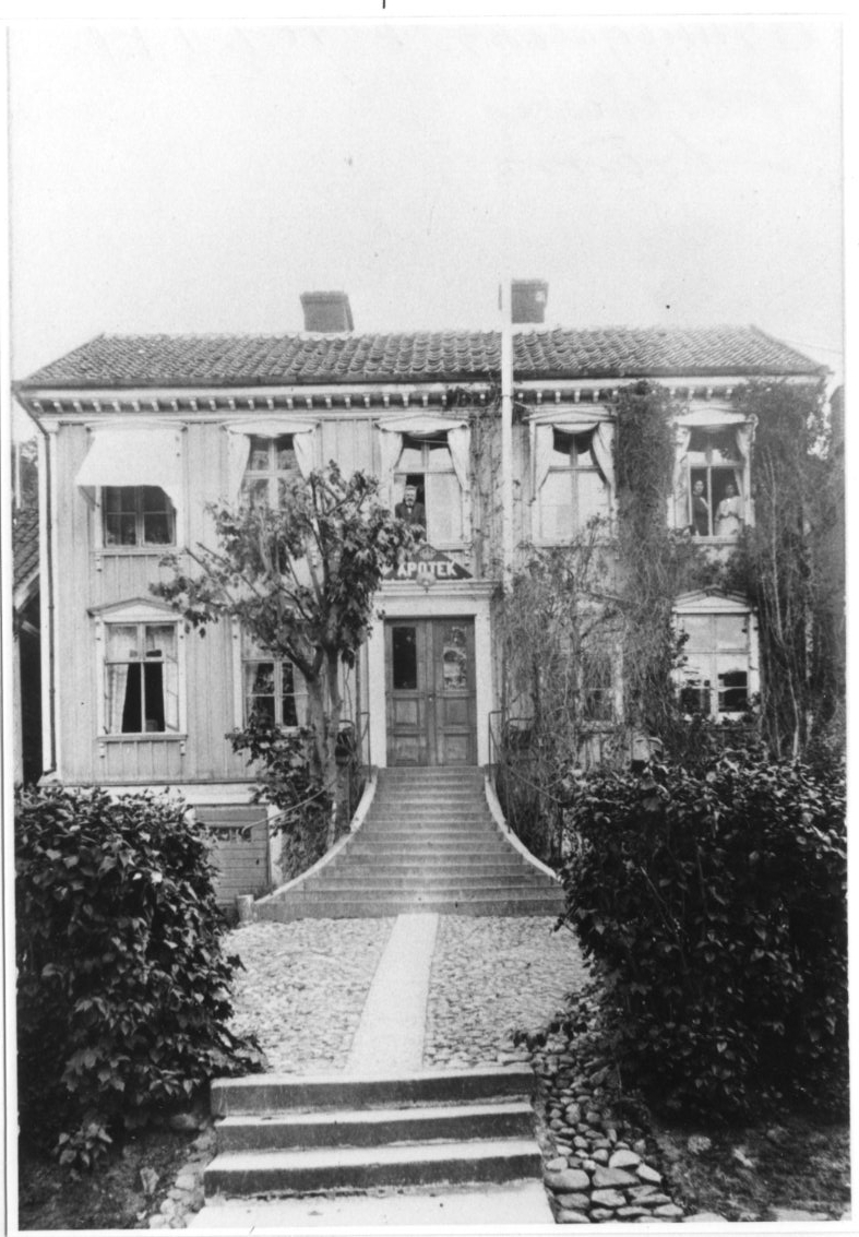 Tvåvåningshus med locklistpanel vid Brahegatan i Gränna. Markiser vid andra våningens fönster. Det mellersta av fem fönster är öppet och en man tittar ut, precis ovanför skylten "APOTEK". Mannen är möjligen apotekaren Ström.
