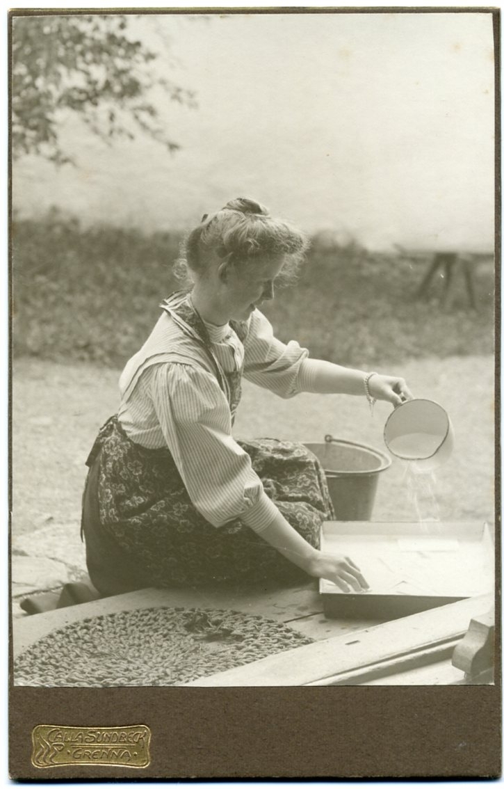 En ung kvinna sitter på en farstutrappa och sköljer fotografier i samband med framkallning.