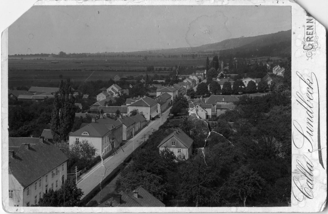 Vy från kyrktornet norrut i Gränna. Målning av kv Välviljan 6 pågår, en stege står rest mot väggen. I nuvarande Braheparken syns fastigheten s k Kappen.