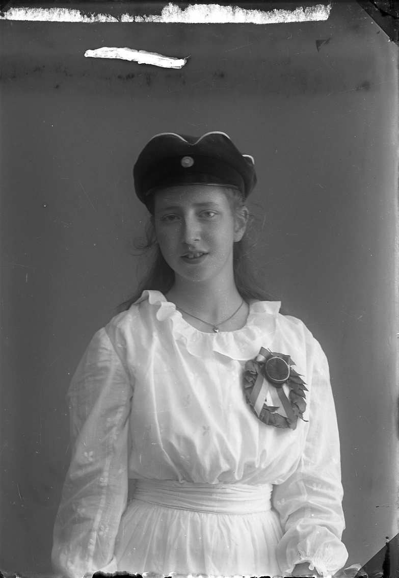 Porträtt av en flicka med huvudbonad och någon form av utmärkelse på bröstet, troligen anknytning till utbildning.