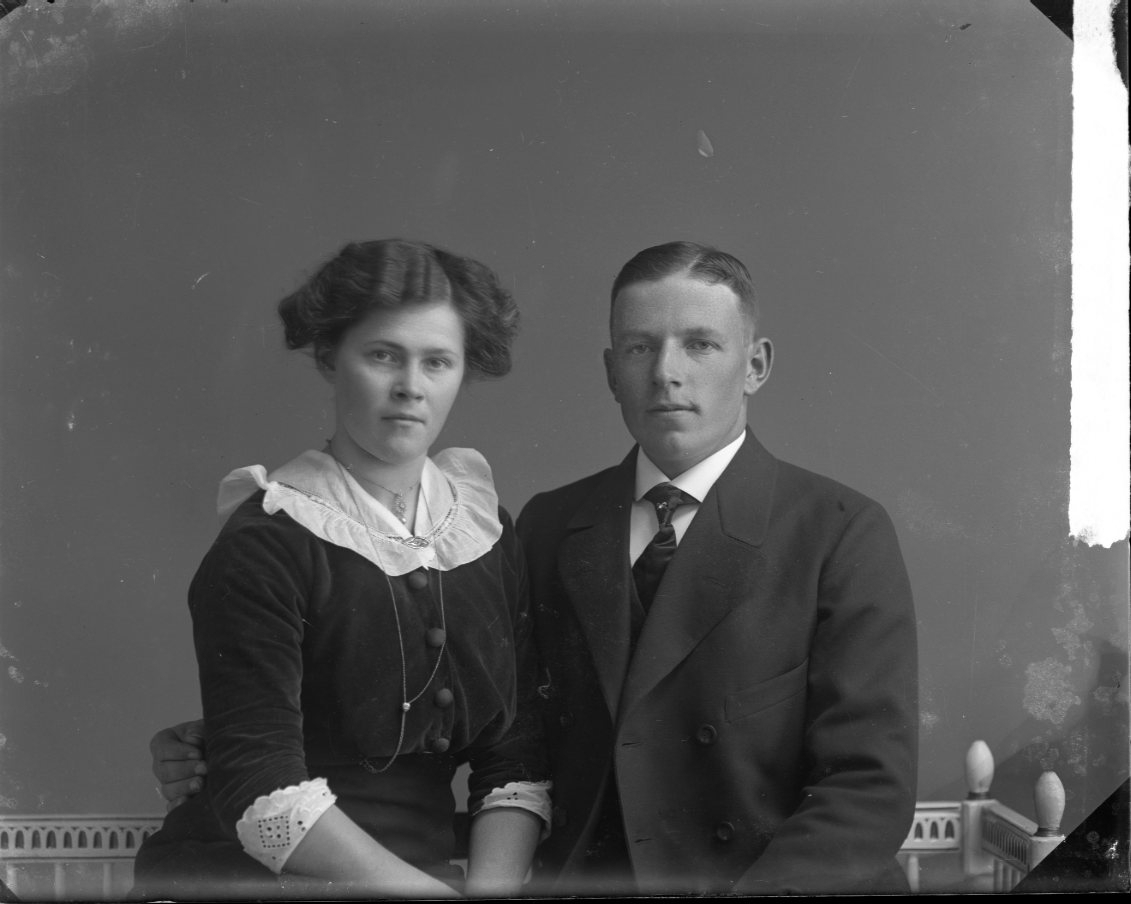 Porträtt av en man och kvinna som sitter intill varandra. Sannolikt ett par.