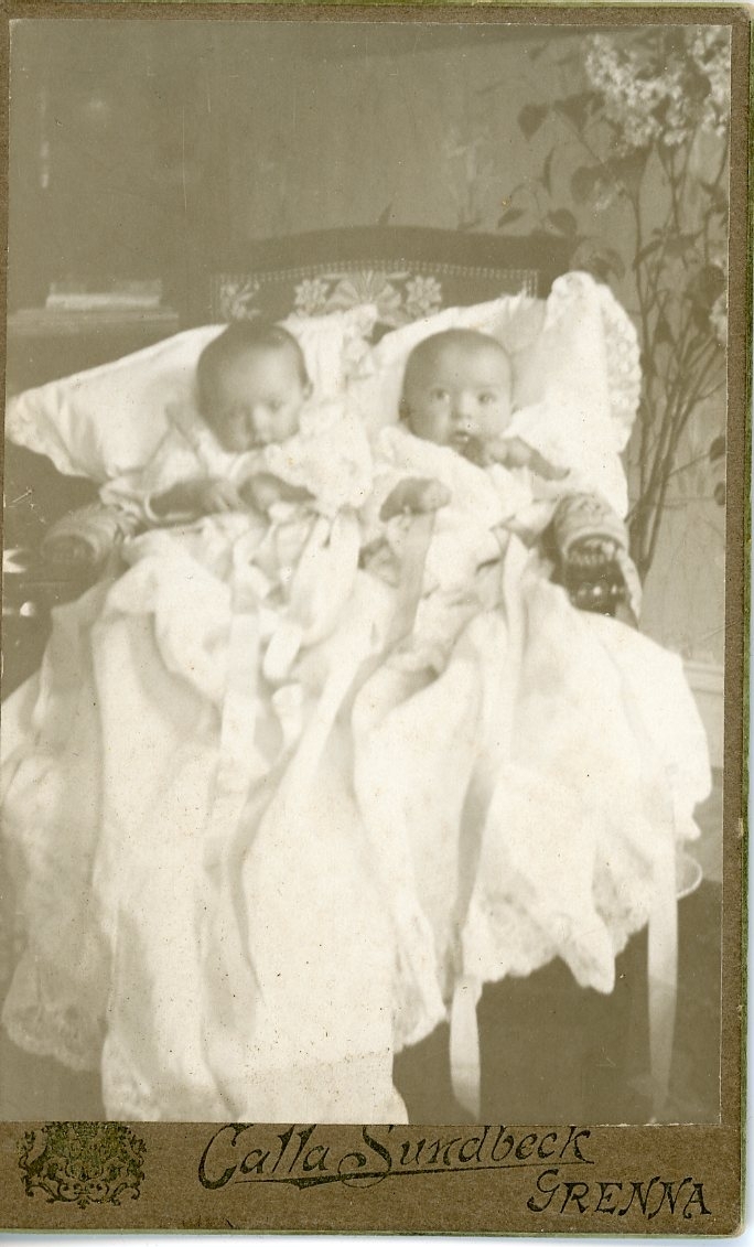 Kabinettsfotografi av två spädbarn som sitter i en stol - tvillingar?