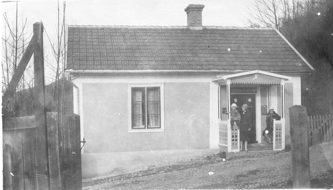 Två kvinnor och ett barn står vid farstun till en liten putsad byggnad utmed en backe.