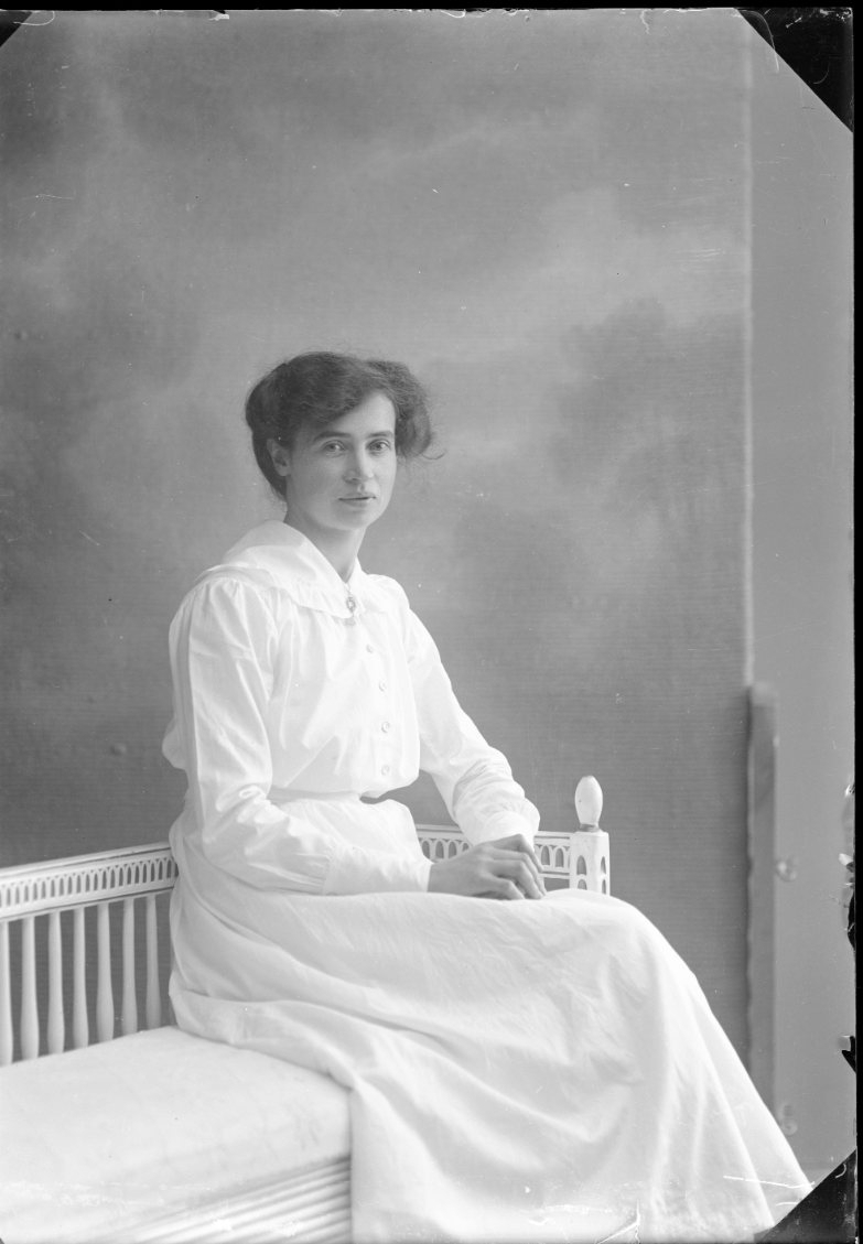 Porträtt av en ung kvinna i ljus klänning som sitter i en soffa.