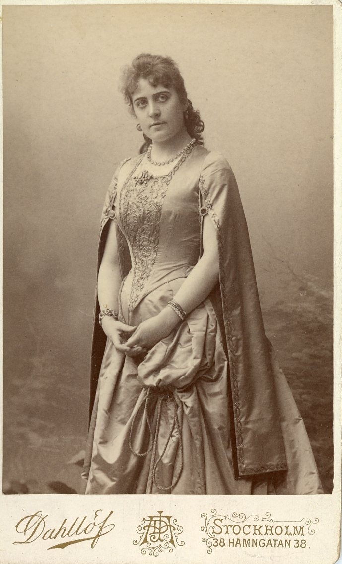 Kabinettsfotografi av en kvinna med elegant klänning med cape.