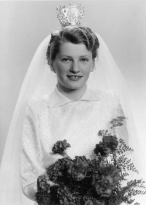 Porträtt av en ung brud som bär Gränna kyrkas nya brudkrona.