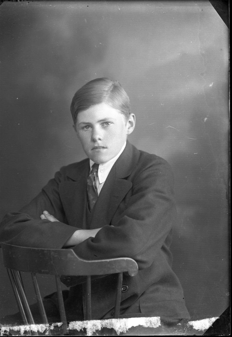 Porträtt av en pojke som sitter bak och fram på en stol med armarna i kors.