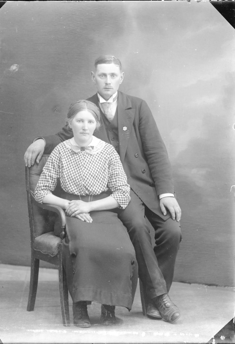 En kvinna i rutigt livstycke sitter i en stol, en man sitter intill på armstödet.