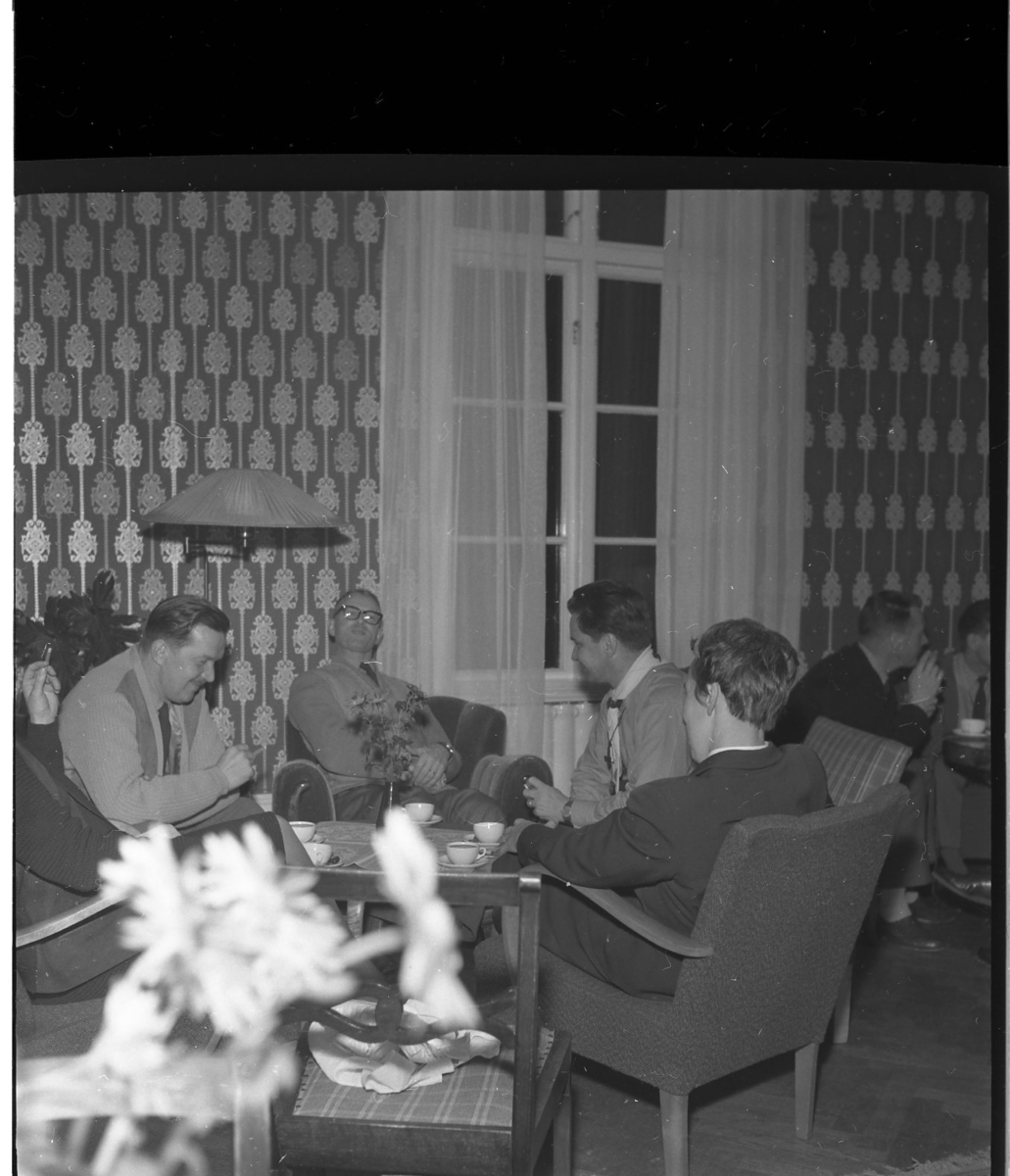 Män sitter i grupper runt bord med kaffekoppar och cigaretter.
