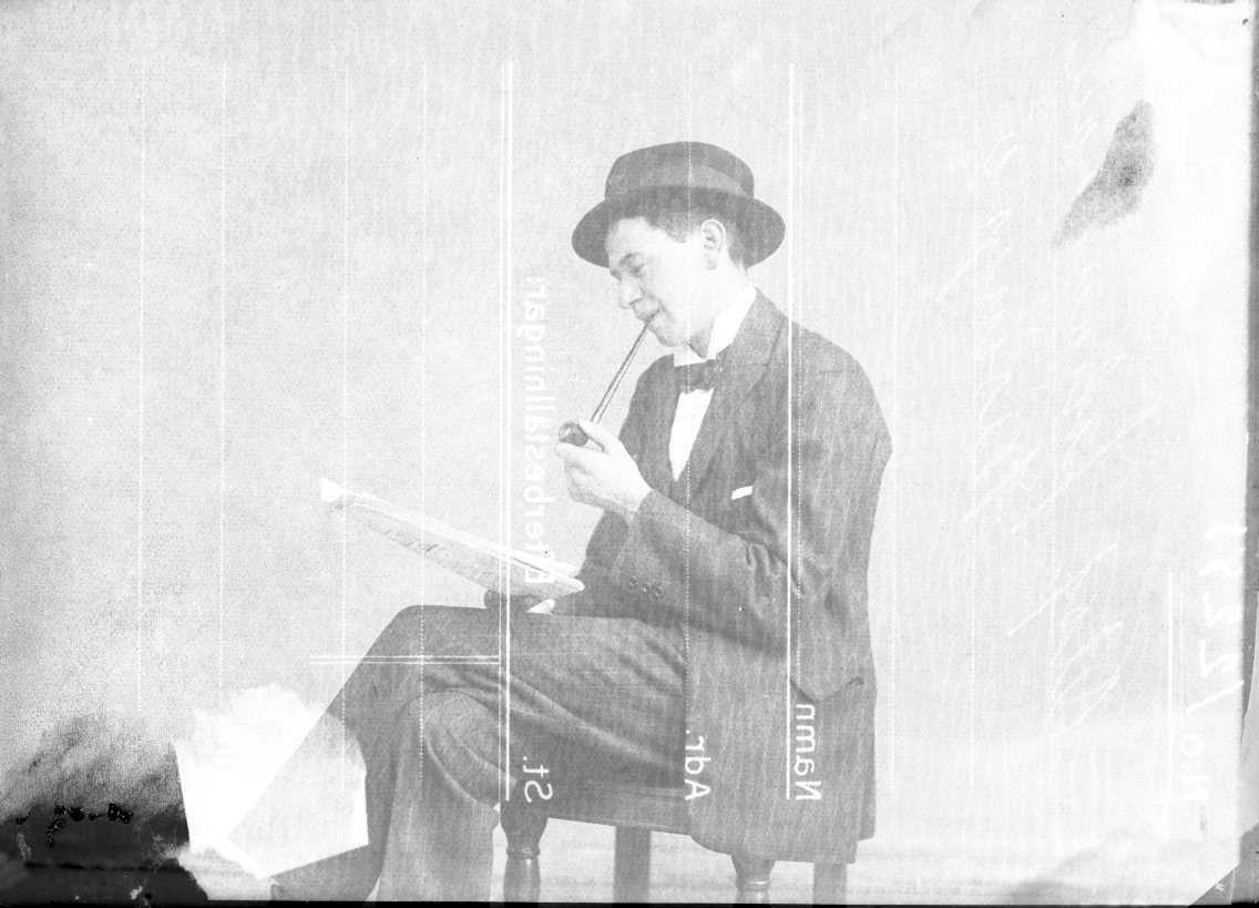 En ung man med hatt, pipa i munnen och tidning i knät sitter på en stol.