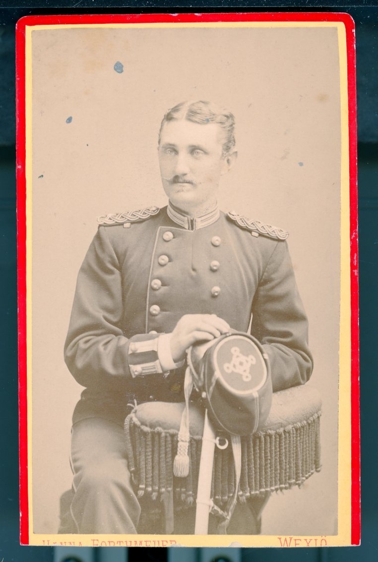 Kabinettsfotografi: löjtnant von Hedenberg i uniform, med mössa och värja i händerna.