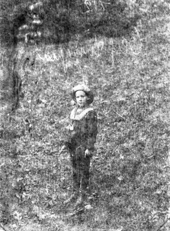 Porträtt av en pojke som står på en gräsplan. Han håller möjligen en tunn bok i vänster hand.