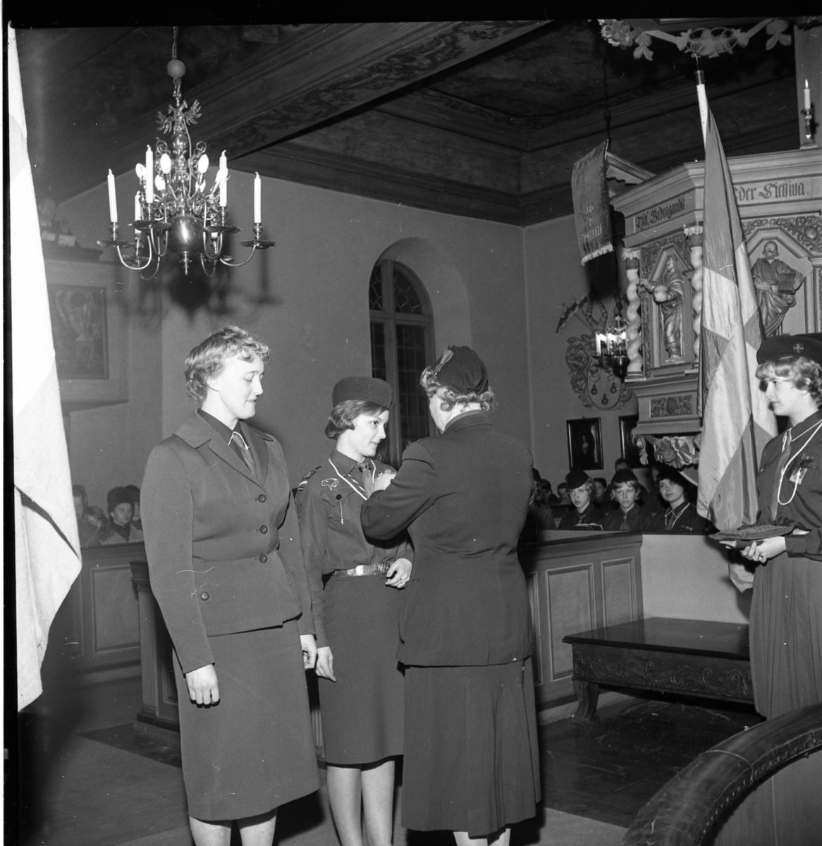 Två scouter uppställda framför en scoutledare. De befinner sig i kyrkan. Ledaren fäster något på en utav scouternas jacka.