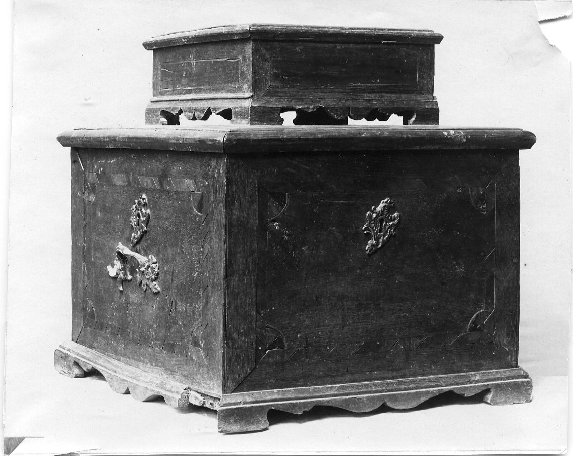 En kista med med en mindre överbyggnad på locket. Sirliga handtag och nyckelbeslag.