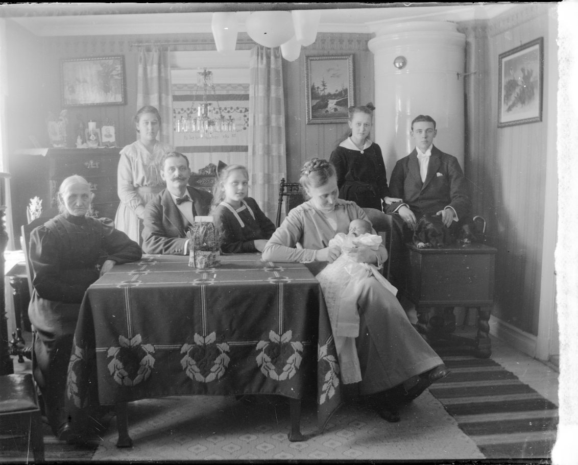 Åtta personer, barn och vuxna, i en hemmiljö runt ett stort bord - den yngsta ett spädbarn i en kvinnans famn. Vit, rund kakelugn i ena hörnet.