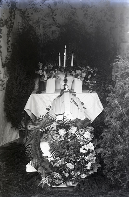 En ljus likkista står på en avsats täckt med ett ljust lakan, framför ett bord med duk, fem ljus och blommor. En krans vid kistans fotände.
