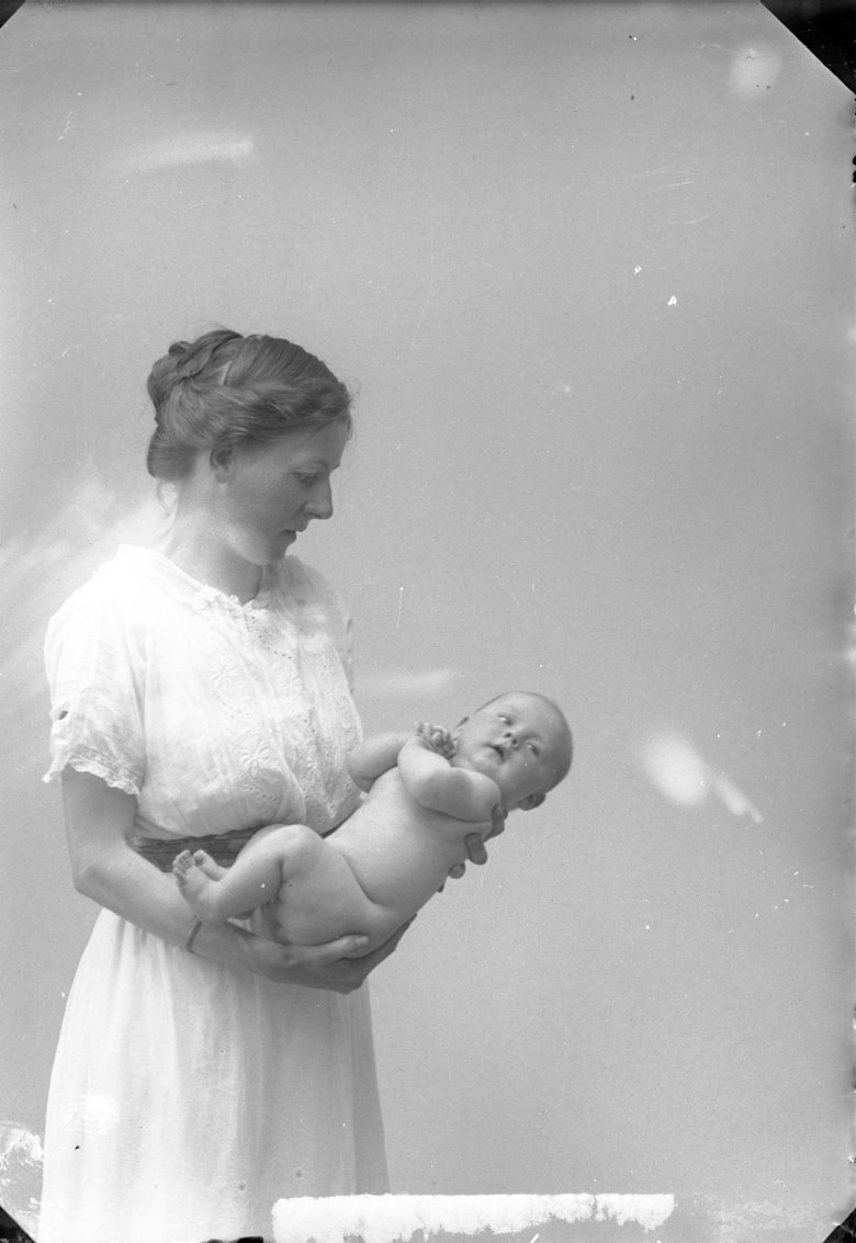 En kvinna i ljus klänning står med ett naket spädbarn i famnen.