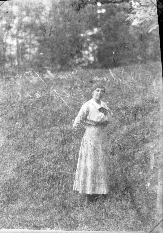 Porträtt av en kvinna som står med händerna bakom ryggen på en gräsmatta.