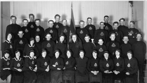 Gruppbild med ett stort antal kvinnliga och manliga frälsningssoldater.