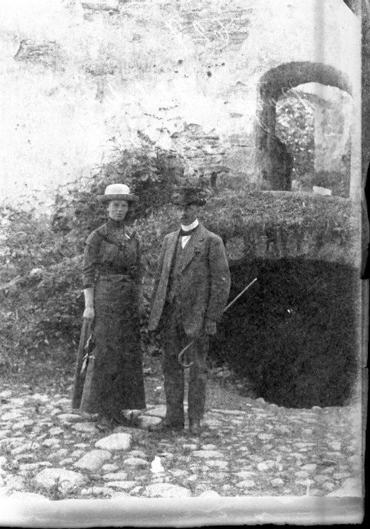 En man och en kvinna står framför ett valv på inre borggården till Visingsborgs slottsruin.