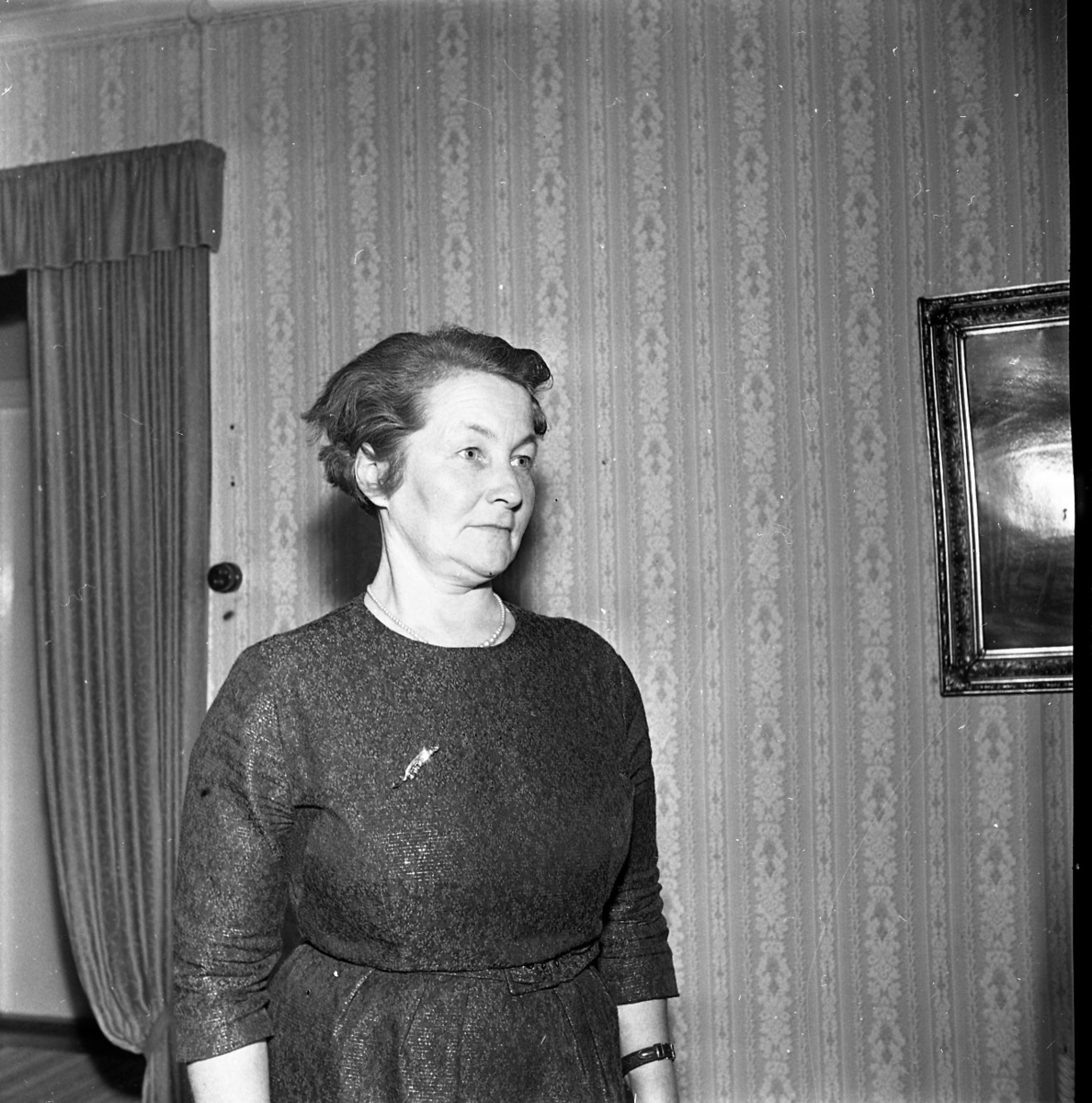 Porträtt av en kvinna. Hon ler och tittar förbi kameran. Hon har kort lockigt hår. Hon bär en klänning med markerad midja. Hon bär ett pärlhalsband och en brosch.