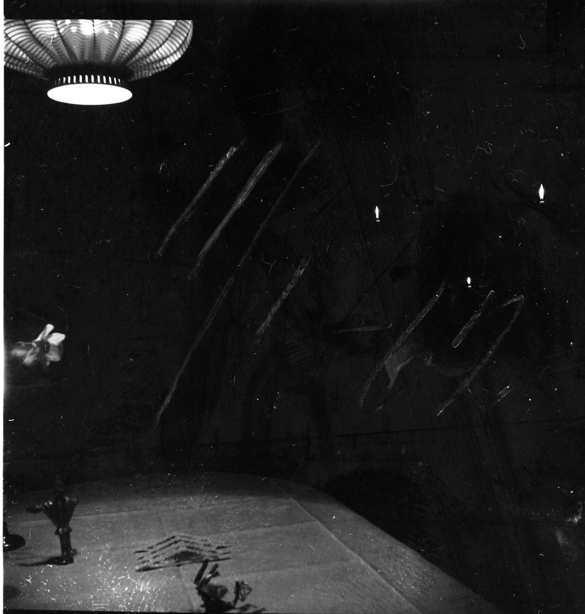 En mörk bild av en interiör. Det enda ljuset kommer från en lampa och några tända ljus i bakgrunden.