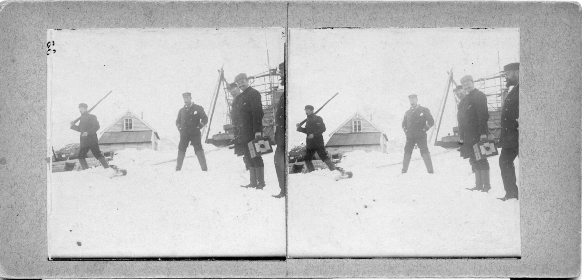 Alexis Machuron med en fångad räv på Danskön, med Norselius, Ehrensvärd, Strindberg och Lembke. Stereoskopisk bild.