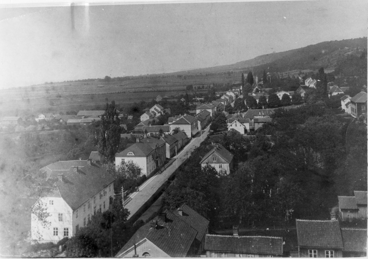 Utsikt över Brahegatan norrut från kyrktornet i Gränna. Till vänster kvarteren Välviljan och Köpmannen, i nederkant kvarteret Brahe. I centrum Braheparken med s k Kappen. Notera pågående fasadmålning på kv Välviljan 6 (Hallska gården). Till höger kvarteren Vulcanus.