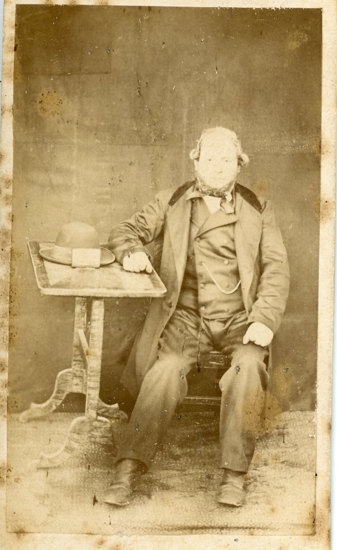 Kabinettsfotografi av en man med skepparkrans som sitter vid ett bord. Hans hatt ligger på bordet.