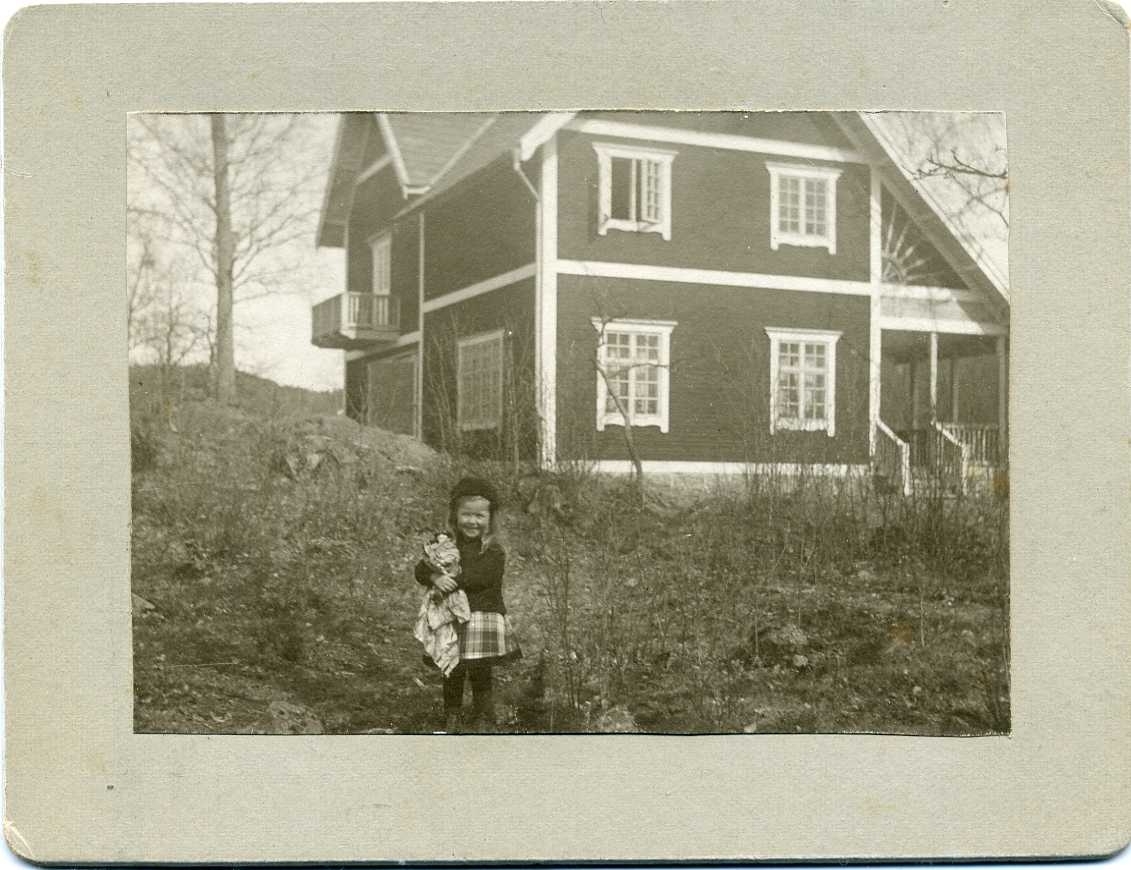 En liten flicka med en docka i famnen står i en trädgård framför ett tvåvåningsnus med träpanel.