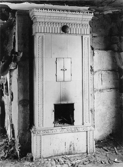 Vit kakelugn med profilerade hörn och överstycke, i ett rivningshus.