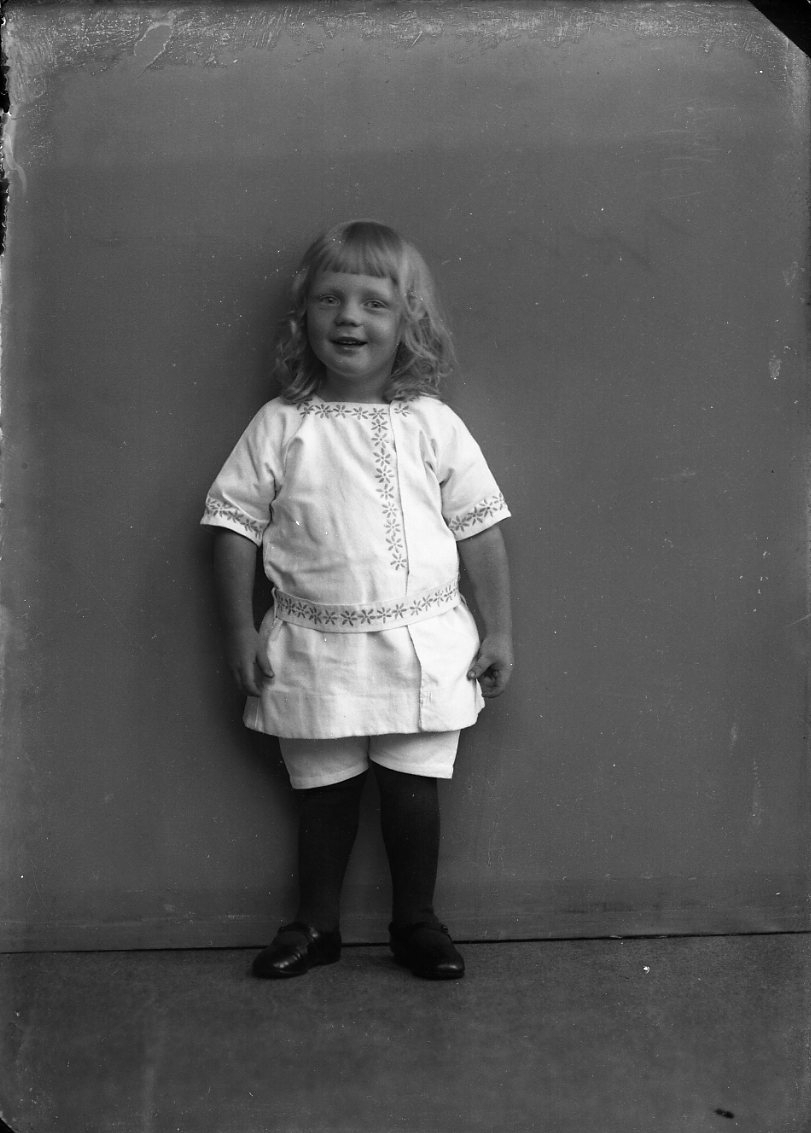Porträtt av en liten pojke med långt lockigt hår.