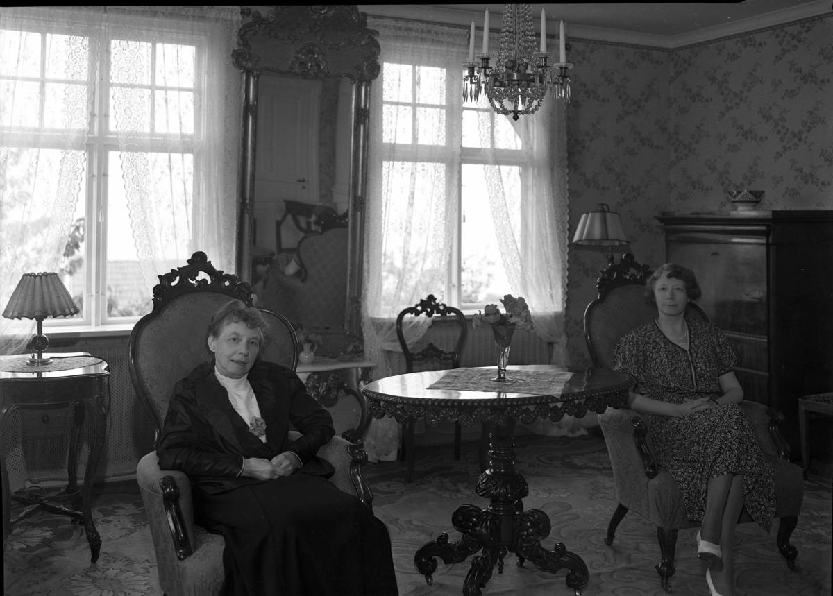 Interiör från en villa. Två kvinnor sitter i varsin emma vid ett ovalt bord som står under en kristallkrona med stearinljus. En hög väggspegel mellan två fönster
