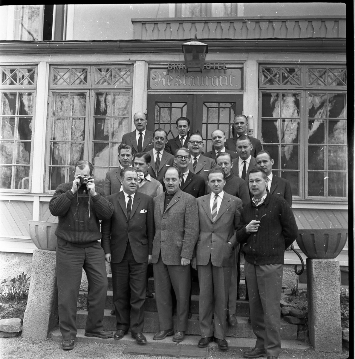 17 män står på gårdssidan till Ribbagården i Gränna.