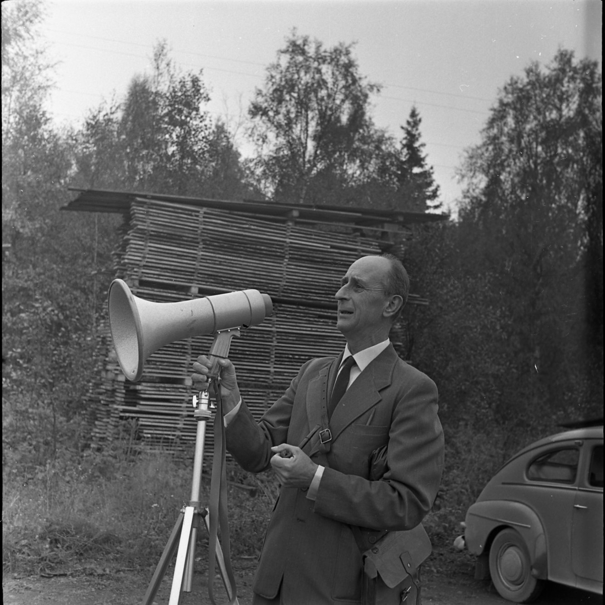 Skogsdag Örserums brunn 1961. En man står och håller upp en megafon framför ansiktet. Han håller en pipa i handen. Bakom honom finns en stapel med plank.