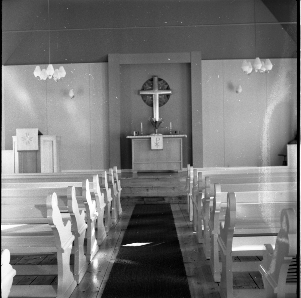 Bilden föreställer mittgången i ett missionshus som leder fram till ett altare. Längst med mittgången står bänkar. På väggen över altaret hänger ett kors.