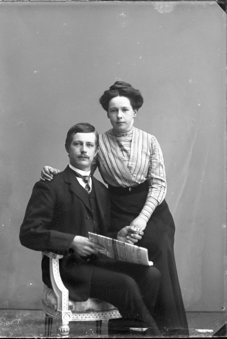 En ung man och kvinna. Han sitter i en stilmöbel med en tidning i sin hand. Hon sitter på armstödet lutad mot mannen. Mannen är Gustaf Johansson från Bunn, Gränna socken.