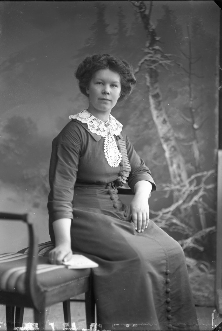Porträtt av en kvinna som sitter på en pall med randigt tyg. Hon håller möjligen en tunn bok i höger hand.