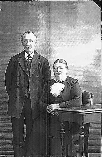 Porträtt av en äldre man och kvinna. Mannen står bredvid kvinnan som sitter vid ett bord.