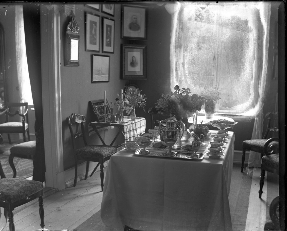 Interiör. Ett rektangulär bord med kaffekoppar, kakfat och (ny)silverkannor. En blomstervas på bordet.