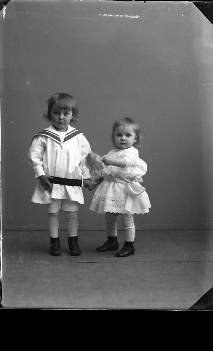 Porträtt av en liten pojke i sjömanskostym och en än mindre flicka som står intill varandra.