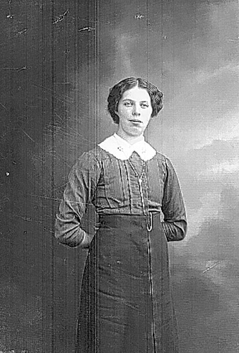 Porträtt av en ung kvinna som står med händerna bakom ryggen.