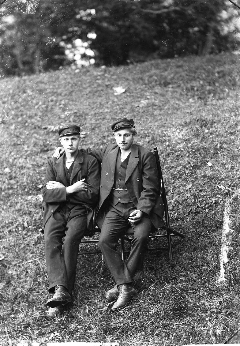 Två ynglingar sitter på enkla stolar på en gräsmatta. En håller armen över axeln på den andra. Bägge bär keps. En av dem är Wiktor Johansson från Rökinge, Visingsö, troligen han till höger.