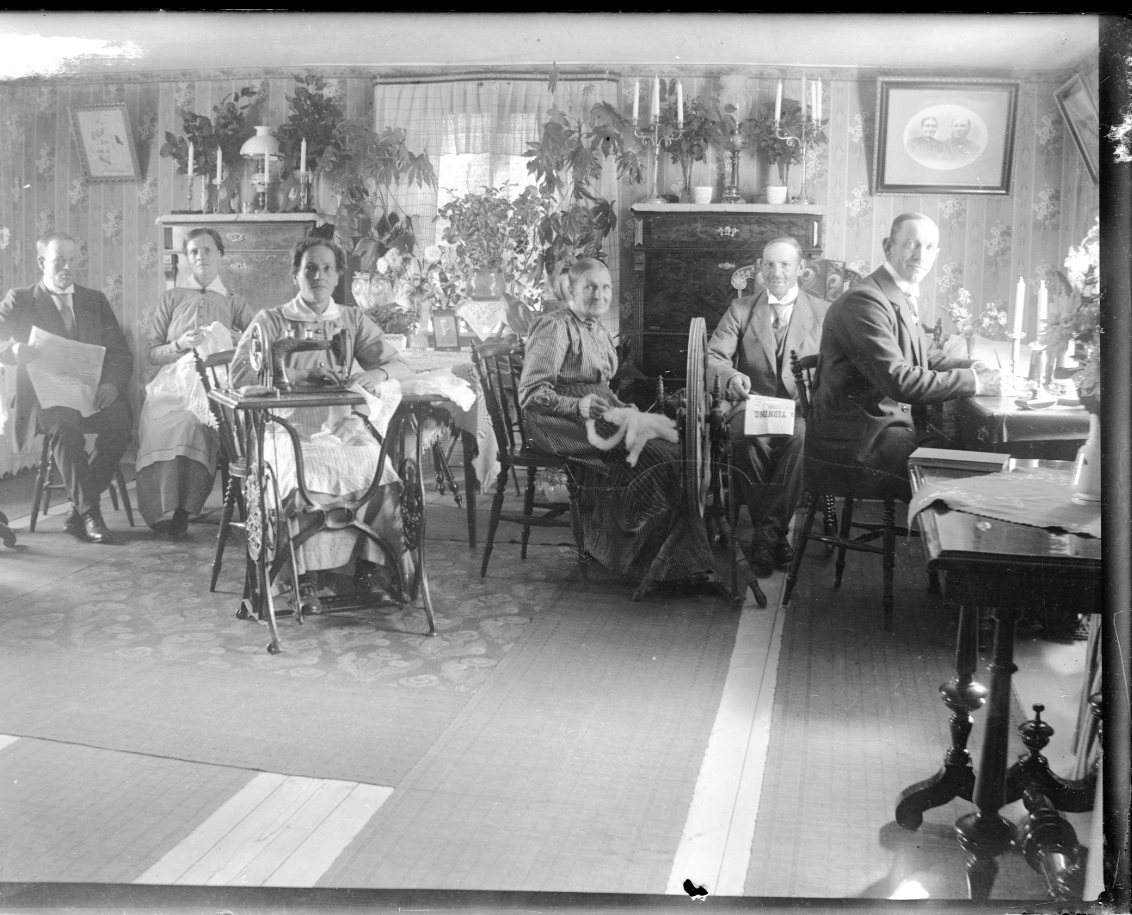 Interiör hos Andersson i Alviken. Tre sittande kvinnor varav två yngre som håller på med sömnad. En man sitter med en tidning till vänster. En annan sitter intill den äldre kvinnan med Grenna Tidning i knät. En tredje man sitter vid ett skrivbord mot ett fönster. Två höga byråar med ljusstakar flankerar ett fönster.