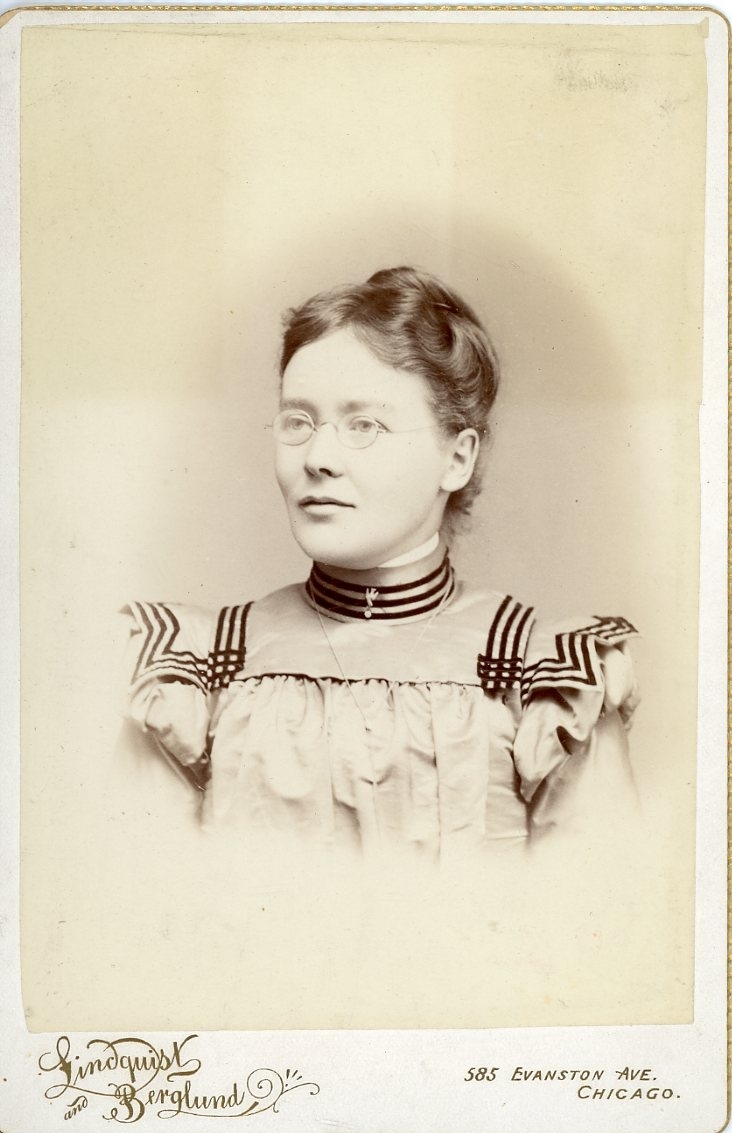 Kabinettsfotografi av en okänd ung kvinna med glasögon.