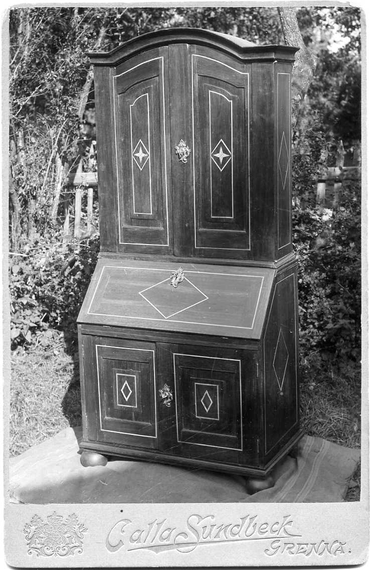 Fotografi av ett skänkskåp som står utomhus på en filt.