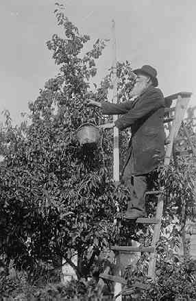 Smedmästare J A Rosenborg står på en stege vid ett päronträd och plockar frukt.